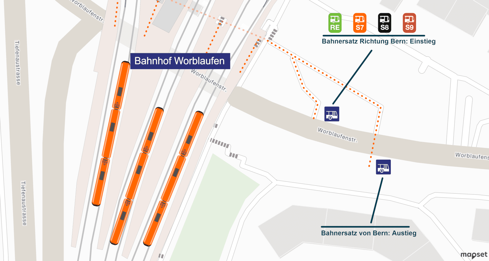 Obwohl es gerade eine grosser Vorteil von mapset ist, dass damit erstellte Pläne dem offiziellen Kartenbild der SBB entsprechen, hatten einige Kunden den Wunsch, ihre eigenen Piktogramme und Schriften in mapset zu verwenden. Neu besteht daher die Möglichkeit, für Kunden ein eigenes Corporate Design zu integrieren. Für den RBS und die VBZ haben wir bereits entsprechende Anpassungen vorgenommen. Die Abbildung zeigt ein Beispiel eines Bahnersatzplans von Worblaufen, in dem die speziellen Linienpiktogramme des RBS in mapset übernommen wurden. Sichtbar ist auch, dass im Rahmen des Corporate Designs Bilder in die mapset-Pläne integriert werden können, im Beispiel sind es Schema-Bilder von RBS-Zügen.